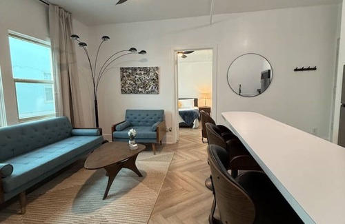 Indulge in the charm of this Mid Century Modern inspired 2 bedroom, located in the heart of downtown Klamath Falls. Featuring two master suites and equipped with a 70" LED TV and two 50" LED TVs, this space is perfect for a luxurious and stylish stay. Enjoy the convenience of being steps away from the new Klamath Commons Park, as well as a short walk to bustling bars and restaurants. Explore all that Klamath Falls has to offer, from its beautiful outdoor recreation options to its rich cultural attractions. With a fully equipped kitchen, high-speed internet, and access to laundry facilities, you'll have everything you need for a comfortable and convenient stay. Don't miss out on the chance to immerse yourself in the vibrant energy of this charming city. Book now and make your visit to Klamath Falls unforgettable!