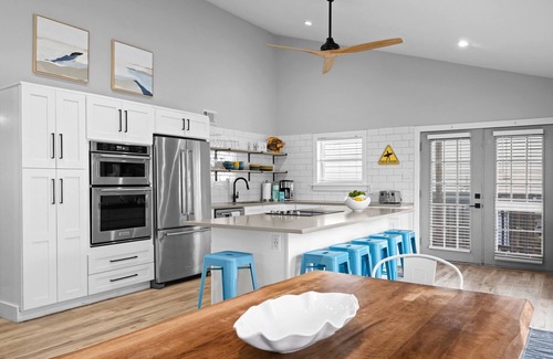 This beach house has a large, fully equipped kitchen that holds everything you need to feed friends and family. The beautiful large island in the kitchen is the heart of the house. The island seats 6 and the beautiful live-edge dining table seats up to 10. For morning coffee or al fresco dining, just outside the kitchen, the covered sitting area is perfect for 5, or head up to the top deck Adirondack chairs for 6 more.