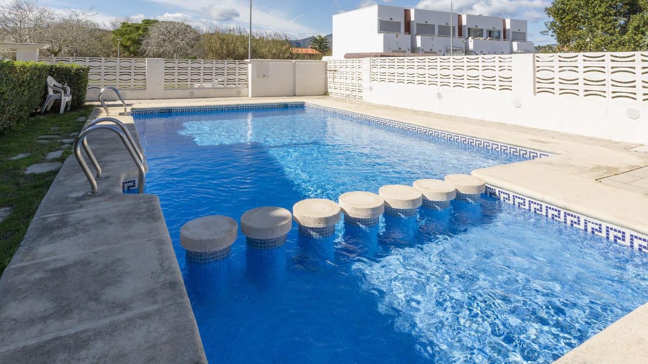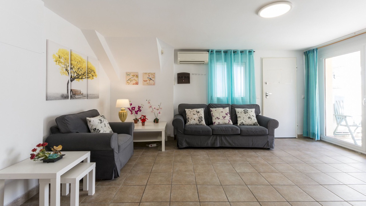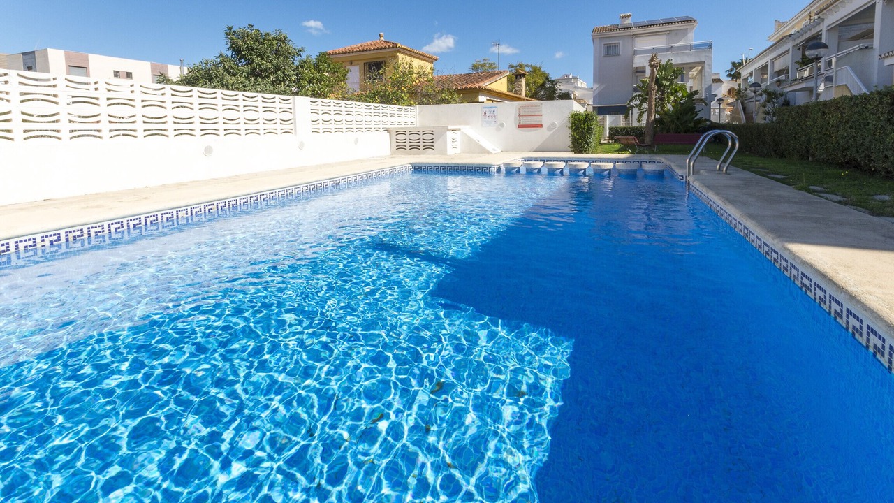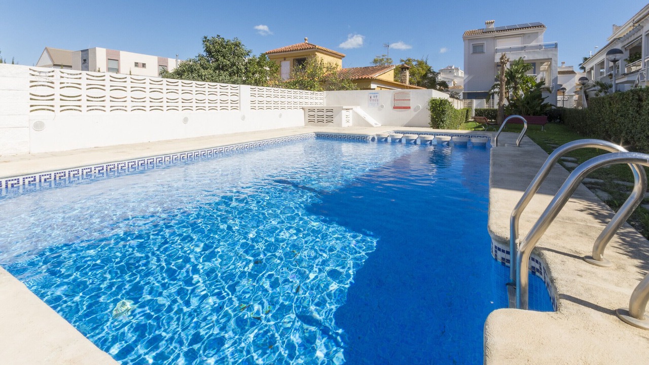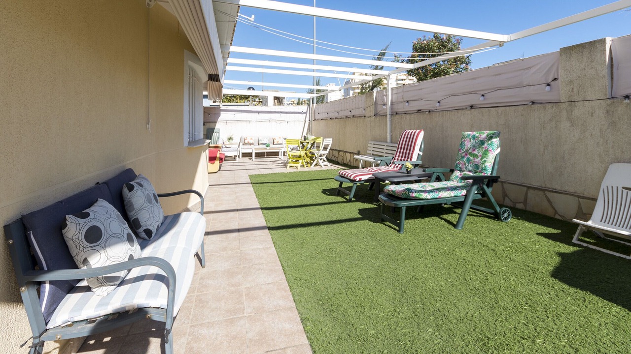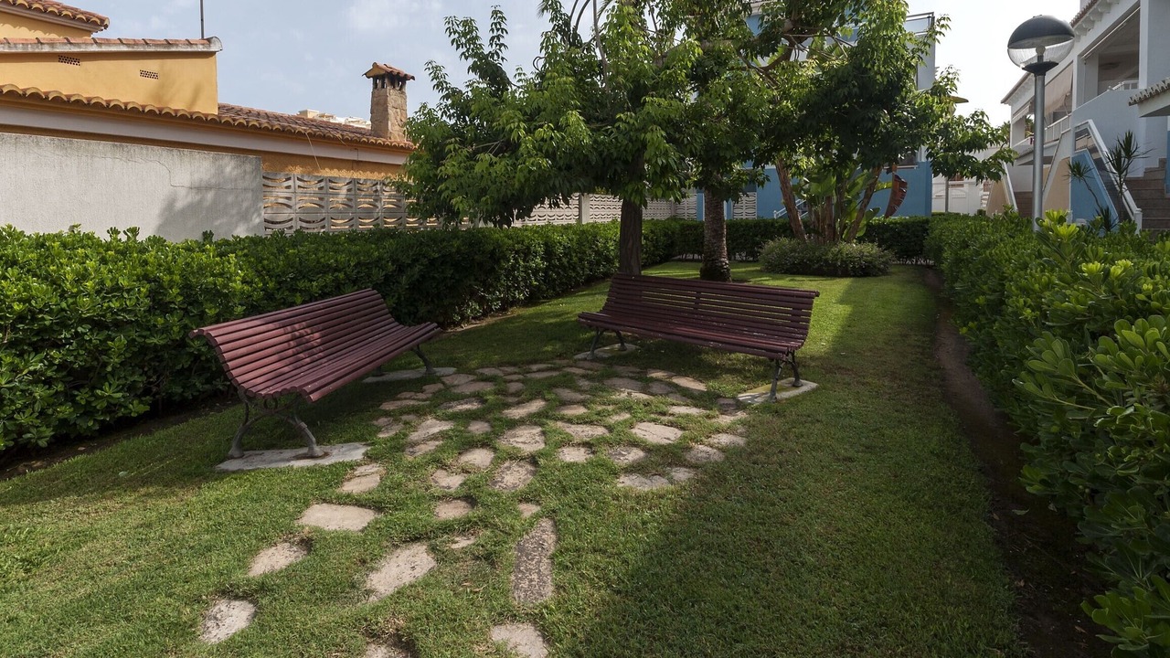 This residential of terraced houses share a beautiful community pool which will be your meeting point after a long beach day. You can wash the salt and the sand off at the helpful exterior showers and then, lets swim!!. The chlorine pool sizes 8 x 5 metres while the depth goes from 1.2 to 1.8 metres. It also features a children pool sizing 6 m2 and 0.5 metres water depth. Then, after cooling down, the little ones can play a bit in the shared garden area while you sit on the benches enjoying the trees shadow. The house also offers comfortable exterior areas to enjoy the good weather in privacy. You can enjoy a succulent breakfast at the terrace of the main floor or a delicious barbecue in the evening.