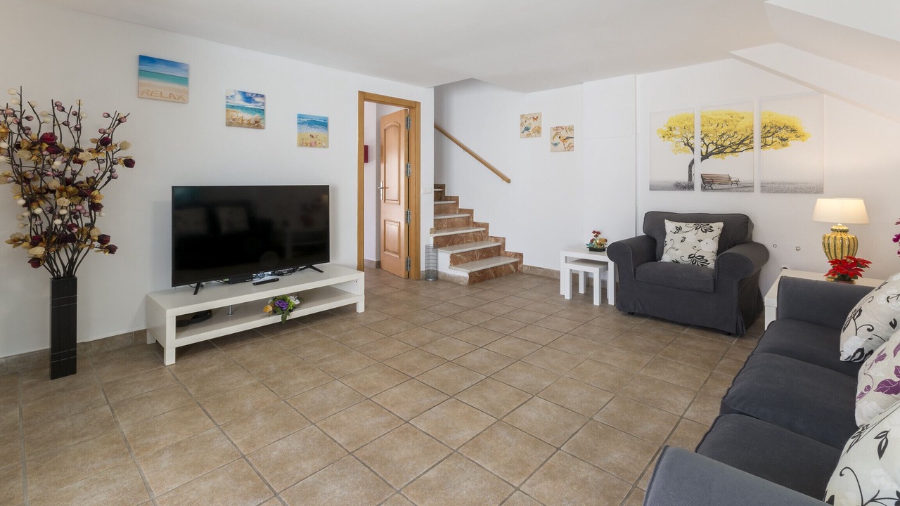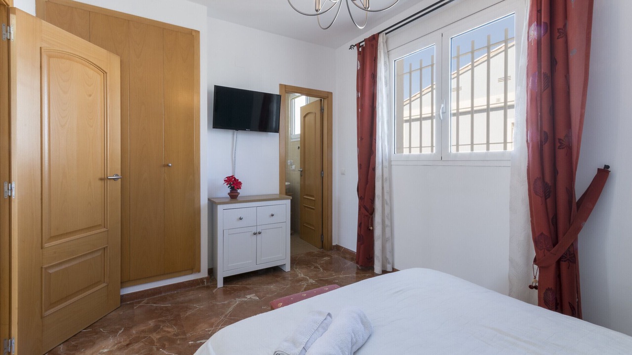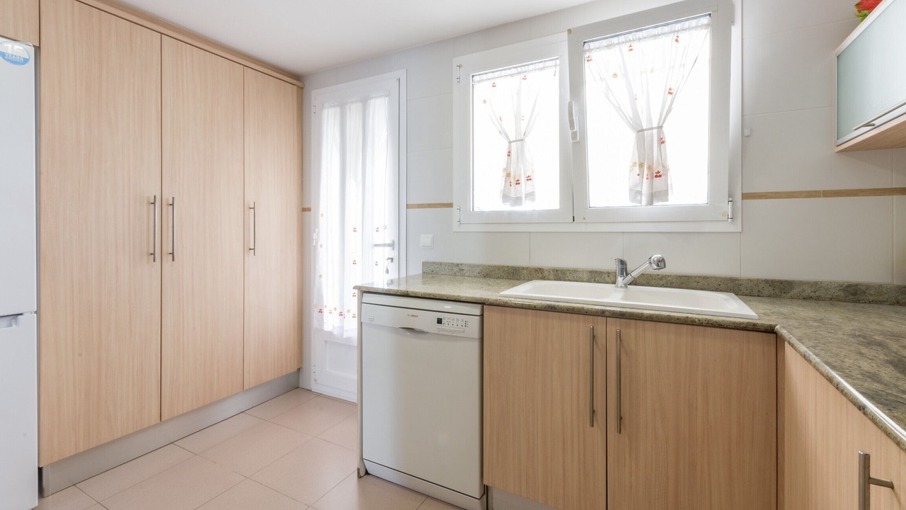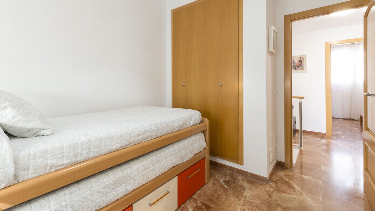 The house has three floors. The exterior staircase leads to the main entrance from where we access the wide and luminous living- dining room. It offers a TV, air-conditioning and a dining table for 6 people. The modern kitchen is independent and it features everything you need to cook during your vacation: ceramic hob, oven, microwave, dishwasher, etc. You will also find a washer, iron and ironing board. A shower bathroom completes the main floor. On the inferior level we find another living-dining room with direct access to the terrace where the barbecue is, so it is perfect to enjoy delicious grilled meats and vegetables while we cool down with the air conditioning. The sofa is a sofa bed. The house offers up to 3 bedrooms, with a wardrobe and ducted air-conditioning, that are located on the first and last floor. The first one has a double bed and en-suite bathroom with a shower. The second one has two twin beds and the last one has a trundle bed. A bathroom with a bathtub completes this storey. In addition, we can prepare a cot and a high chair in case you are travelling with your children.