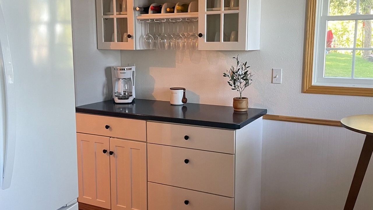 - Full kitchen with newer appliances and essentials including oven/stove, coffee pot, microwave, fridge/freezer combo
