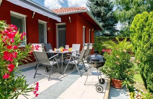 Balatonszemes 7 km from Balatonlelle: Modern, beautiful house "Sunshine", built in 2014. In the resort, 450 m from the lake, 1 km from the beach. Private: property 1'200 m2, garden 1'000 m2 (fenced), lawn for sunbathing. In the house: WiFi, central heating system, air conditioning. Grocery 500 m, supermarket 6 km, restaurant 300 m, bakery 1 km, café 800 m, bus stop 200 m, railway station 800 m, grass beach 500 m, outdoor swimming pool 600 m. Riding stable 3.5 km, cycle lane 500 m, children's playground 300 m.