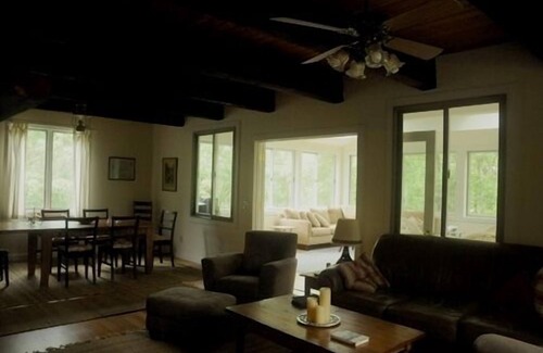 The property is set in a quiet residential neighborhood at the end of a deep wooded lot, ideal for a relaxing and convenient family vacation. With the newly added four season sun room, there are many places to be together or spread out and rest. There is over one acre of land. Your privacy will feel wonderful. The eat-in kitchen opens with French doors into a large patio. You may enjoy an outdoor shower or nap in the hammock